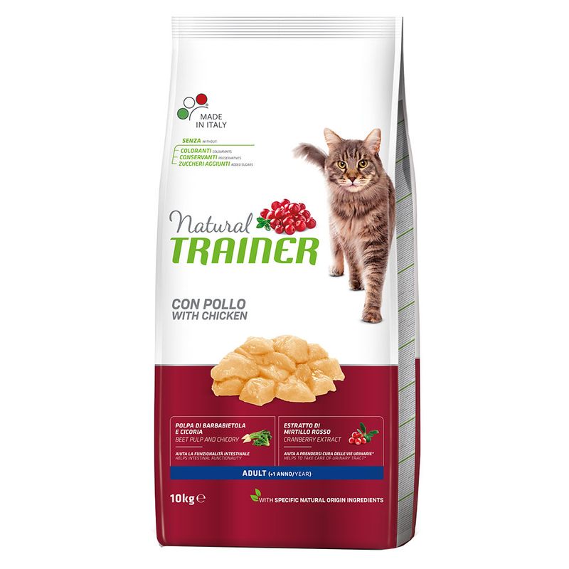 Trainer Natural Adult cu pui permite o schimbare de hrană fără probleme și în siguranță, deoarece urmează instinctul urinar natural al pisicii după schimbarea hranei. Întrucât conține zinc și drojdie de bere, această hrană uscată premium contribuie la o piele suplă și o blană frumoasă. Pe lângă asta, hrana este produsă fără a fi testată pe animale, nu conține potențiatori de aromă și nu conține conservanți și coloranți.