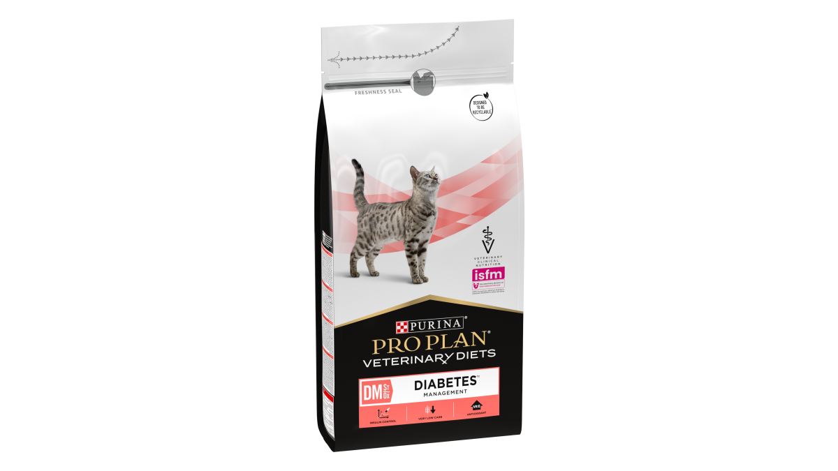 Hrana completă dietetică se remarcă prin conținutul adaptat de energie, ce poate contribui la controlul greutății. Purina Pro Plan Veterinary Diets Feline DM ST/OX - Diabetes Management are un conținut scăzut de zahăr și este bogată în proteine.