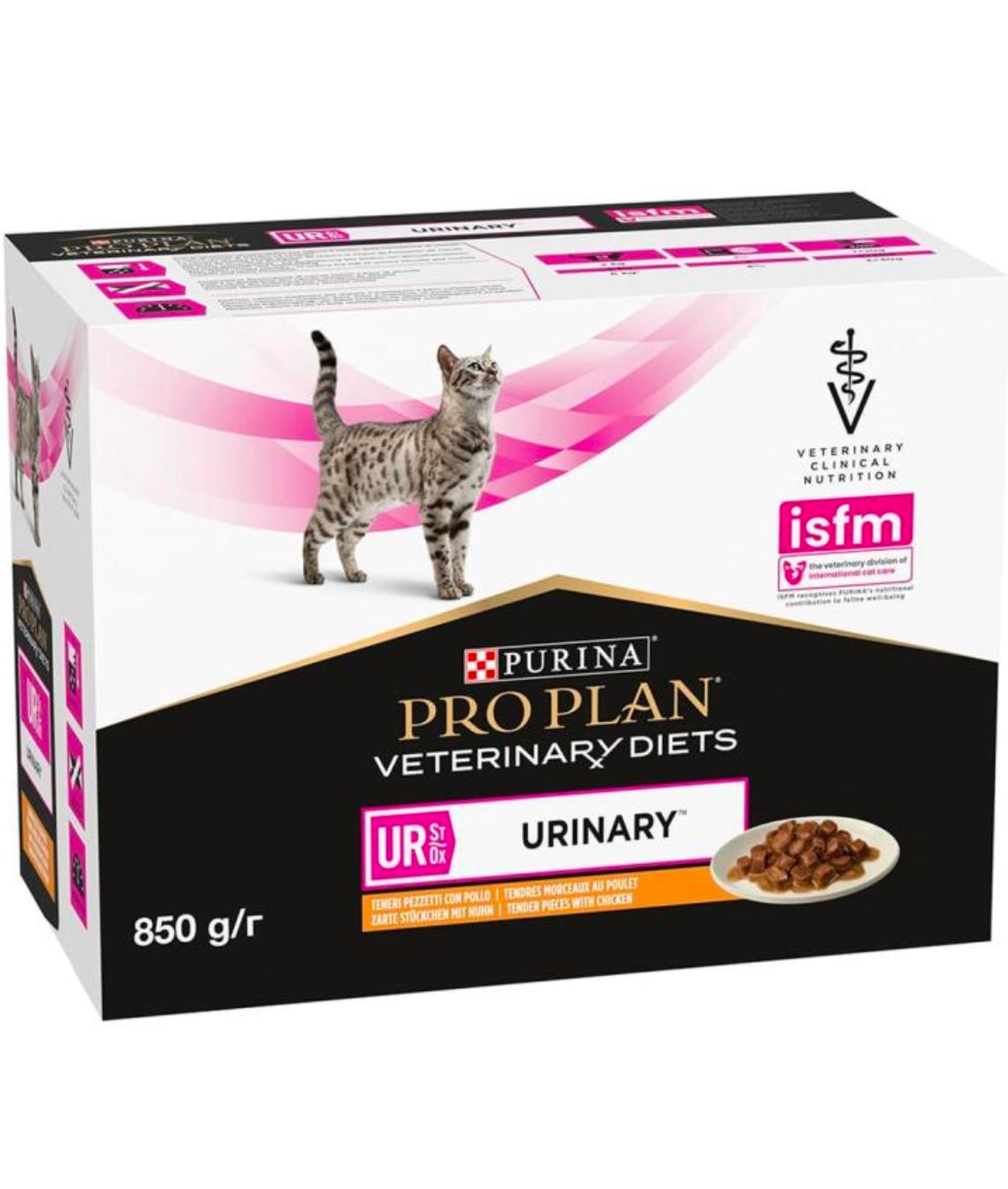 Această hrană dietetică pentru pisici este formulată pentru a susține dizolvarea calculilor urinari existenți și a reduce riscul de formare a altora noi. Purina Pro Plan Veterinary Diets Feline UR ST/OX - Urinary Somon conține mai puțin magneziu și minerale. Hrana dietetică se caracterizează, de asemenea, prin proprietăți de acidifiere și subsaturare a urinei.
