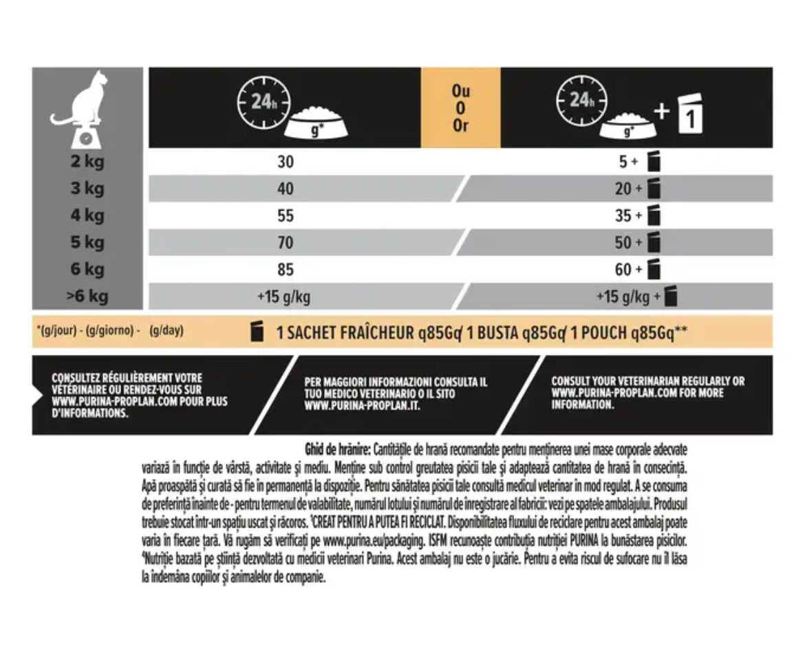 Fiecare portie de hrana uscata are ca ingredient principal somonul de inalta calitate. Produsele Pro Plan sunt imbogatite cu un amestec specific de nutrienti pentru a sprijini functiile creierului executiv (gandire logica, rezolvarea problemelor, functia de memorie si adaptarea la situatii noi). Potrivit si pentru mentinerea sanatatii rinichilor si greutatii corporale ideale.